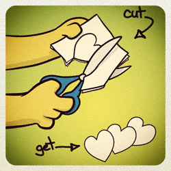 First of all, she showed us how to make a good shamrock pattern. All you need to do is take 3 pieces of paper, one on top of the other. Then draw a nice heart on the top sheet. After you have drawn the heart, cut out the shape through all three pieces of paper. You should get 3 heart shapes that are all the same.