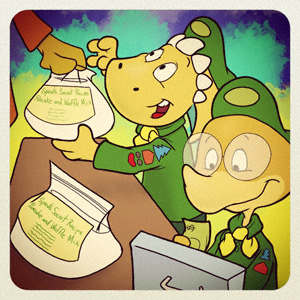 The Sprouts even use this recipe for when they have overnight camps. One year they had a fundraiser where they mixed up the dry mix and sold it in big zipper bags as “Sprouts Secret Recipe Pancake and Waffle Mix” with instruction on the label taped to the bag. As I recall, they did pretty good with that one.