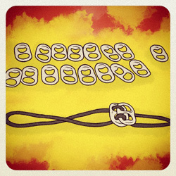 It’s really easy to make, once you get it started. First you need aluminum can tabs. I used about 26 to make my bracelet. Teresa used closer to 50 for her choker. You also need two pieces of cord or shoe laces at least 3 or 4 times times longer than what you want your finished piece to be. I wanted my ends to drop down with a knot at the ends, so I made sure my laces were long. I lined up all my tabs and my cord to start.