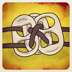 First I took two tabs and half overlapped them with the rough sides together. I strung the cord from the bottom of the top hole of one tab, over the edge of the second tab and back down again. Then I took the second cord and did the same thing on the bottom holes of the two tabs. I crossed the laces so that the top one was now on the bottom and the bottom lace was on the top. Next I tucked a third tab under the top tab and just touching the side of the bottom tab. Then I brought the cords up through the holes of the third tab and came out the top of the holes on the second tab. If you flip the tabs over, you’ll see you have a cross pattern on the bottom side and a straight pattern on the top side.