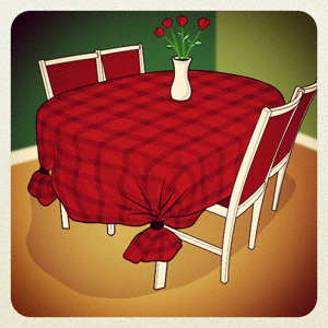 Now I still have a flat sheet left over, so I use that as a table cloth on my dining table which is across from the living room. Martha Stewart, eat your heart out! When the table is stretched out, the sheet as a table cloth is just the right size, but if table is made smaller, the sheet hangs over quite long. I solve that problem by slipping napkin rings on each corner and sliding them up to gather up the fabric.