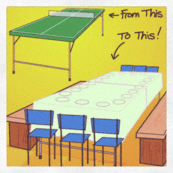 40 years ago when my sister was the only person lucky enough to have a basement with a ping pong table, we held all our Christmas family gatherings at her house. Not only did that keep the kids busy downstairs while the adults were visiting upstairs, but come mealtime, she had a table big enough to put everyone around. We could squeeze 20 of us around that ping pong table sitting on folding card table chairs and benches made from wooden crates with planks strung between them.