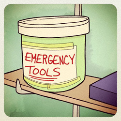 A hammer, a multi-bit screwdriver, a pair of pliers, a set of precision screwdrivers, a tape measure, a small electric drill, a small flashlight, a roll of duct tape and a roll of clear packing tape. (a pair of needle nose pliers and wire cutters are often very handy as well.) You should also have a small assortment of nails and screws, nuts and bolts. We use an old dishwasher soap bucket which holds all our stuff quite nicely, and sits on the shelf ready to reach for any time we need it. Of course, I have a fully equipped shop for bigger jobs, but often all we need it that emergency tool can.