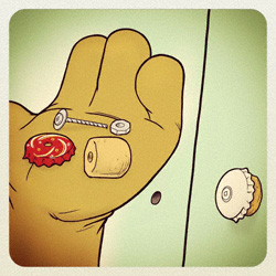 When we had a knob came off a cupboard door, I remembered that I used bottle caps to make knobs for the doors a set of play kitchen cupboards from cardboard boxes. BooBear and I have been saving all sorts of bottle caps, so I found one that was sturdy, cut a piece of cork the right depth the fit into it just to give it some backing and then drilled a hole through the cork and the bottle cap. Then I just put a bolt with the head at the top of the bottle cap and through it and the hole in the drawer with a nut on the other side of the drawer to hold it tight. Just so it matched the cupboards and didn’t look like a bottle cap, I gave it a bit of paint. I keep meaning to pick up a real knob at the hardware store, but that bottle cap is working so darned well!